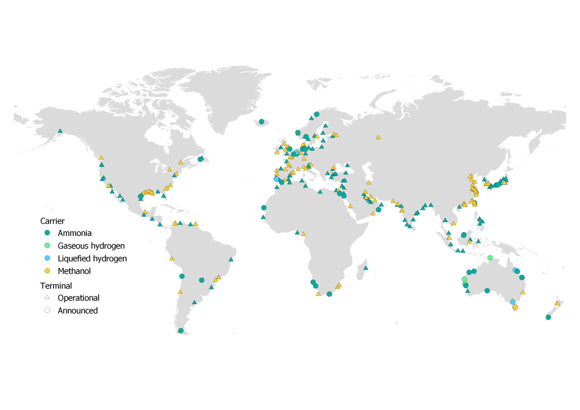 This map covers all projects under development of hydrogen pipelines, underground storage facilities and import/export terminals dedicated to low-emissions hydrogen and hydrogen-based fuels. Worldwide, there are more than 100 natural gas liquefaction plants in more than 40 ports and more than 160 natural gas regasification plants in 150 ports. Approximately 150 terminals and ports can handle ammonia. To learn more, please visit the IEA Hydrogen Production and Infrastructure Projects Database.