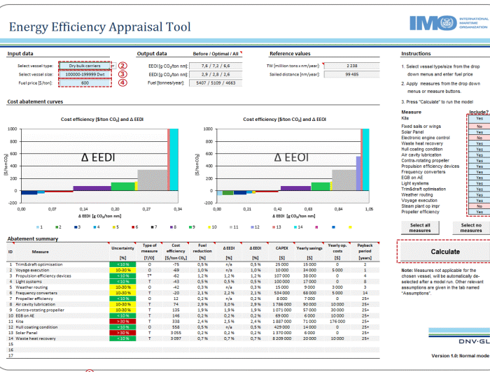 This Excel tool provides a model to appraise technical and operational measures for ships. Developed by IMO GreenVoyage2050 project.